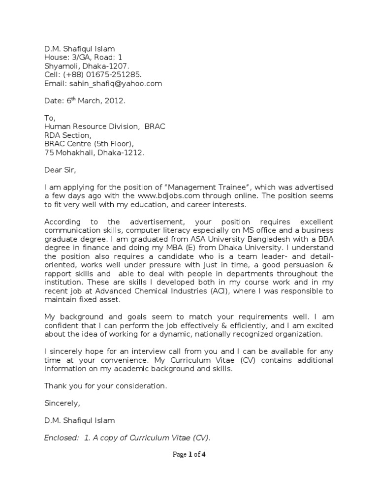 Finde den richtigen job auf stepstone. Necessary papers and documents are attached with this letter for your reference and. I am enclosing my cv for your glance. Sample of cover letter for job application in bangladesh. Application for the post of senior assistant officer (cash).